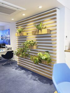 Diese deckenhohe Lamellenwand bringt mit Ihren echten Grünpflanzen nicht nur Stil, sondern auch Wohlfühlatmosphäre in Ihr Reisebüro.