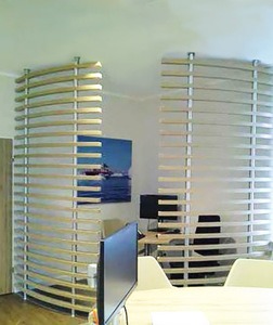 Die zwei leicht gerundeten, deckenhohen Lamellenwände schaffen einen eigenen, ruhigen Bereich und sind gleichzeitig ein ansprechendes Designelement. Perfekt für jede kreative Ecke!